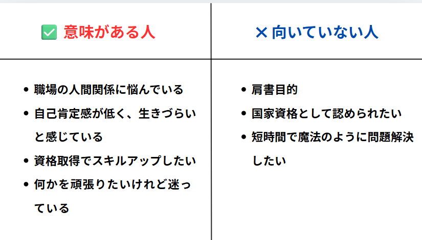 逆に、肩書き目的(国家資格で評価されたい)や、短時間で魔法のように悩みを解決したい人には向きにくいです。