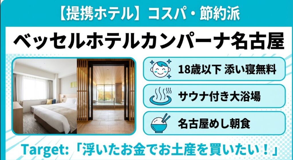 | ベッセルホテルカンパーナ名古屋 | 提携 | 18歳以下無料 | 名古屋飯充実 | 名駅 徒歩9分 | 大浴場完備&圧倒的コスパ | 詳細を見る |