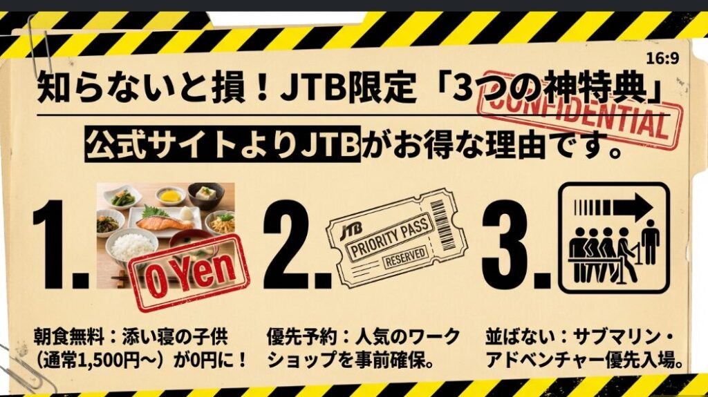 - JTB特典:コンボ2DAYパスポート付プランなど、公式ならではの特典満載。