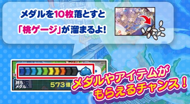 10枚落とすと桃ゲージがMAXになり、メダルやアイテムがもらえます。