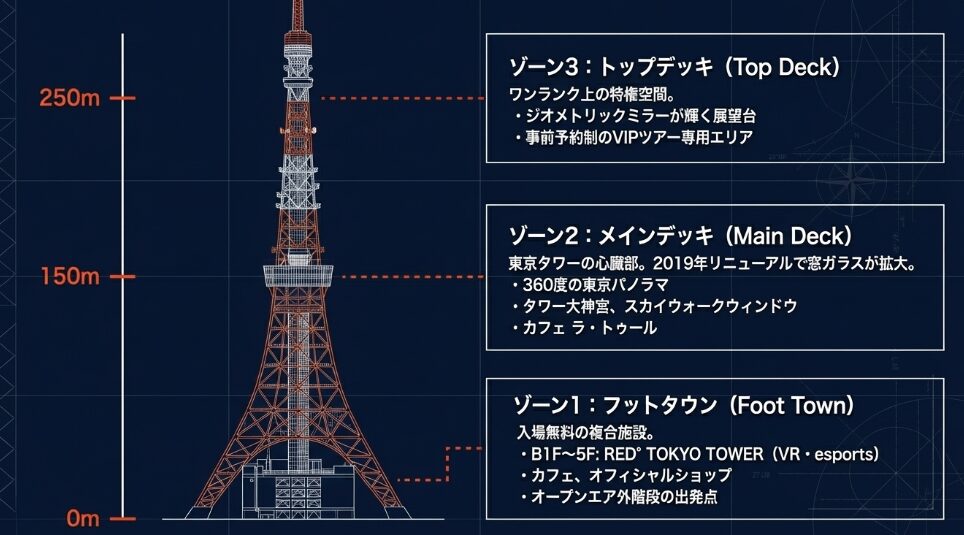 東京タワーには、地上150mの「メインデッキ」と、さらに高い250mからの絶景を楽しめる「トップデッキ」の2つの展望台があります 。