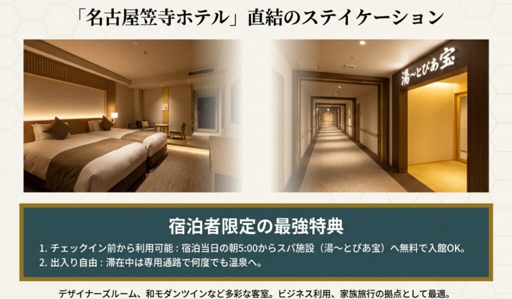 名古屋笠寺ホテルの宿泊者は「湯~とぴあ宝」を無料で利用できます。